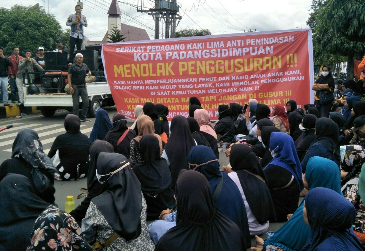 Di sepanduk yang dibentangkan di ruas jalan di depan kantor Wali Kota P. Sidempuan bertuliskan ” serikat pedagang kaki lima anti penindasan Kota P. Sidempuan, menolak penggusuran.
