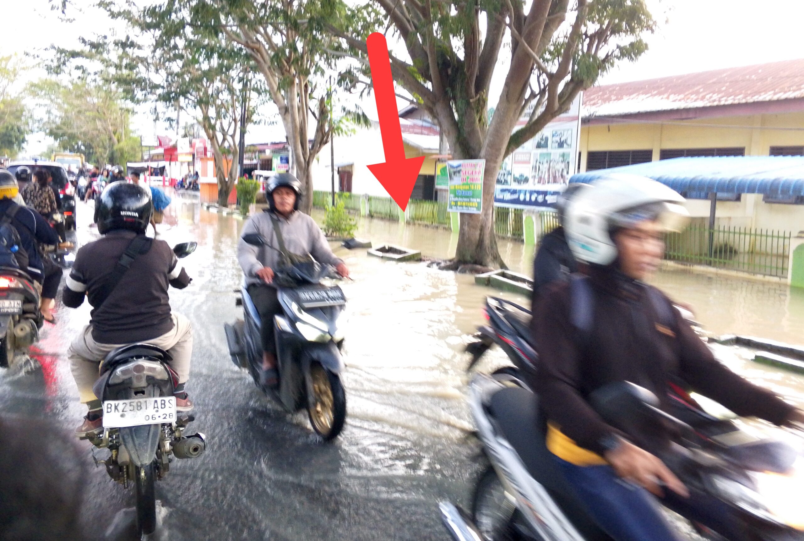 Dua hari terakhir ini, sejak kayu besar tumbang menimpa pagar kantor PTPN, alat mesin pemotong pohon memperparah genangan banjir, sehingga 2 unit alat berat dan 2 unit truk pengangkut sampah dikerahkan dengan pengawalan ketat aparat Satpol PP.