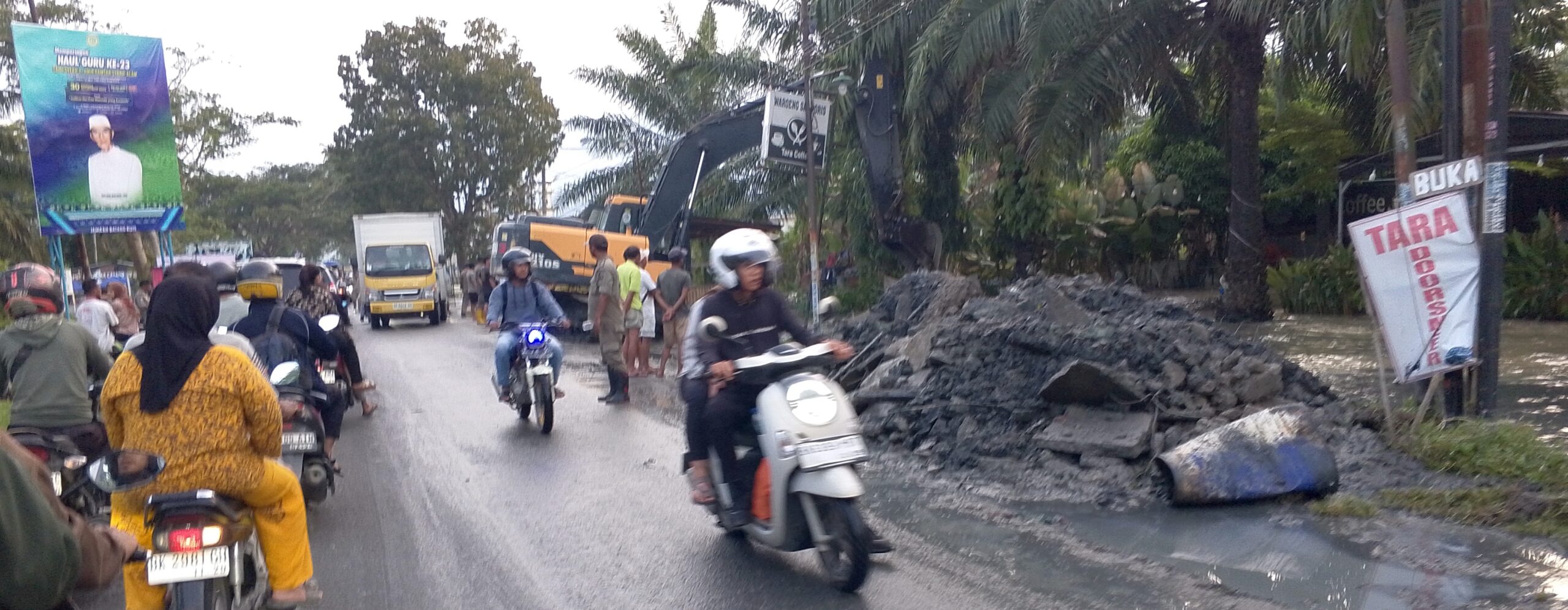 Dua hari terakhir ini, sejak kayu besar tumbang menimpa pagar kantor PTPN, alat mesin pemotong pohon memperparah genangan banjir, sehingga 2 unit alat berat dan 2 unit truk pengangkut sampah dikerahkan dengan pengawalan ketat aparat Satpol PP.