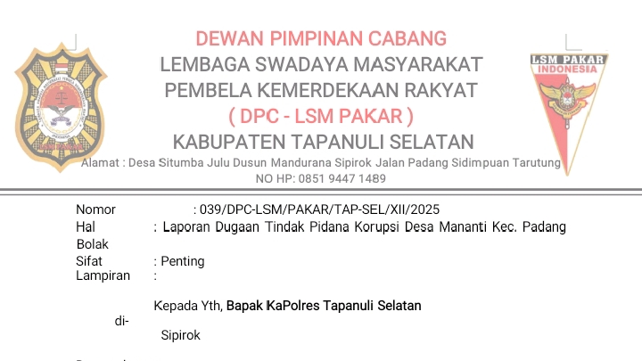 Dugaan korupsi Kades Mananti Kec Padang Bolak Kab Padang Lawas Utara ( Paluta ) provinsi Sumatera Utara ( Sumut ) resmi dilaporkan LSM PAKAR DPC Tapsel ke Polres.