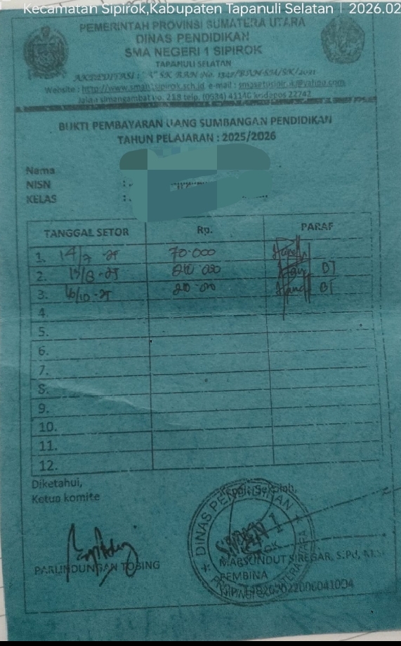 Pengakuan peserta didik ( PD ) SMAN 1 Sipirok Kab Tapanuli Selatan ( Tapsel ) provinsi Sumatera Utara ( Sumut ) bila tak membayar iuran, tidak boleh ikut ujian.